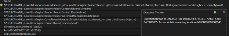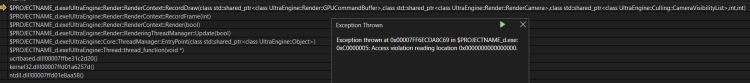 Default start map from template Happens after first enter press: Comment in loop "world = CreateWorld();" to get another render crash (RecordDraw) but it's not consistent and may take several attempts (Andy have this issue i believe): #include "UltraEngine.h" #include "ComponentSystem.h" using namespace UltraEngine; int main(int argc, const char* argv[]) { RegisterComponents(); auto fiplugin = LoadPlugin("Plugins/FITextureLoader"); auto displays = GetDisplays(); auto window = CreateWindow("Ultra Engine", 0, 0, 1280 * displays[0]->scale, 720 * displays[0]->scale, displays[0], WINDOW_CENTER | WINDOW_TITLEBAR); auto framebuffer = CreateFramebuffer(window); auto world = CreateWorld(); WString mapname = "Maps/start.ultra"; auto scene = LoadMap(world, mapname); //Main loop while (window->Closed() == false and window->KeyDown(KEY_ESCAPE) == false) { if (window->KeyDown(KEY_ENTER)) { world = CreateWorld(); scene = LoadMap(world, mapname); } world->Update(); world->Render(framebuffer); } return 0; }