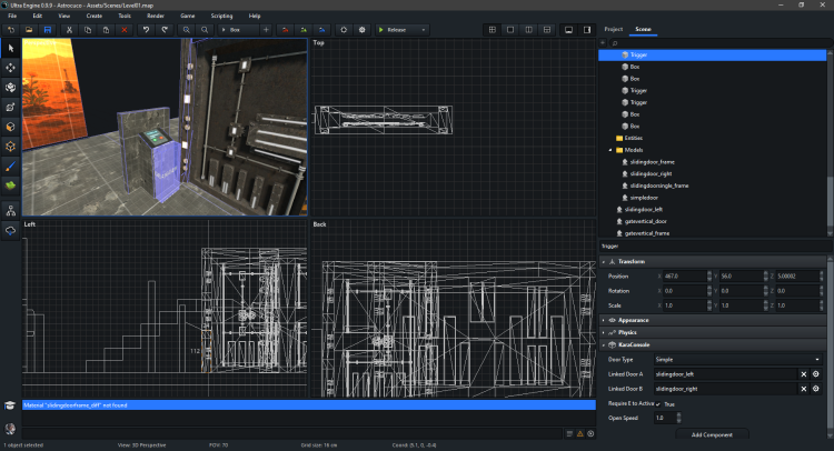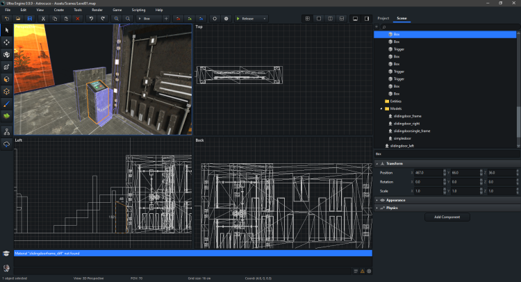 Look at 123 line loadingWorld->Render(framebuffer); I was doing similar thing to show loading screen when main menu was loading #include "UltraEngine.h" #include "ComponentSystem.h" using namespace UltraEngine; shared_ptr<World> gameWorld; shared_ptr<Interface> gameUi; shared_ptr<World> loadingWorld; shared_ptr<Interface> loadingUi; shared_ptr<Camera> loadingCamera; shared_ptr<Camera> uiCamera; shared_ptr<Map> gameScene; shared_ptr<Window> window; shared_ptr<Framebuffer> framebuffer; shared_ptr<Widget> menuPanel; bool isMenuOn = false; bool isMainMenuOn = true; bool resumeGameButtonCallback(const Event& ev, shared_ptr<Object> extra) { menuPanel->SetHidden(true); isMenuOn = false; return true; } bool mainMenuButtonCallback(const Event& ev, shared_ptr<Object> extra) { isMainMenuOn = true; return true; } bool newGameButtonCallback(const Event& ev, shared_ptr<Object> extra) { isMainMenuOn = false; return true; } bool exitButtonCallback(const Event& ev, shared_ptr<Object> extra) { exit(0); return true; } void guiInit() { // Load a font auto font = LoadFont("Fonts/arial.ttf"); // Create user interface gameUi = CreateInterface(gameWorld, font, framebuffer->GetSize()); gameUi->SetRenderLayers(2); gameUi->root->SetColor(0.0f, 0.0f, 0.0f, 0.0f); // Create ui camera uiCamera = CreateCamera(gameWorld, PROJECTION_ORTHOGRAPHIC); uiCamera->SetPosition(float(framebuffer->GetSize().x) * 0.5f, float(framebuffer->GetSize().y) * 0.5f, 0); uiCamera->SetRenderLayers(2); uiCamera->SetClearMode(CLEAR_DEPTH); int menuWidth = 200; int menuHeight = 200; int indent = 25; menuPanel = CreatePanel(framebuffer->size.x * 0.5 - menuWidth / 2, framebuffer->size.y * 0.5 - menuHeight / 2, menuWidth, menuHeight, gameUi->root); menuPanel->SetColor(0.2, 0.2, 0.2, 1); menuPanel->SetLayout(1, 1, 1, 1); menuPanel->SetHidden(true); int buttonWidth = menuWidth - indent * 2; int buttonHeight = 50; int posIter = 0; int buttonY = indent + posIter * (buttonHeight + indent); auto resumeButton = CreateButton("Resume", indent, buttonY, buttonWidth, buttonHeight, menuPanel); ListenEvent(EVENT_WIDGETACTION, resumeButton, resumeGameButtonCallback); posIter = posIter + 1; buttonY = indent + posIter * (buttonHeight + indent); auto mainMenuButton = CreateButton("Main Menu", indent, buttonY, buttonWidth, buttonHeight, menuPanel); ListenEvent(EVENT_WIDGETACTION, mainMenuButton, mainMenuButtonCallback); } int main(int argc, const char* argv[]) { RegisterComponents(); //Load FreeImage plugin (optional) auto fiplugin = LoadPlugin("Plugins/FITextureLoader"); //Get the displays auto displays = GetDisplays(); //Create a window window = CreateWindow("Ultra Engine", 0, 0, 1280 * displays[0]->scale, 720 * displays[0]->scale, displays[0], WINDOW_CENTER | WINDOW_TITLEBAR); //Create a framebuffer framebuffer = CreateFramebuffer(window); //Create a world auto world = CreateWorld(); //Load a font auto font = LoadFont("Fonts/arial.ttf"); // LOADING loadingWorld = CreateWorld(); loadingUi = CreateInterface(loadingWorld, font, framebuffer->GetSize()); loadingUi->SetRenderLayers(2); loadingUi->root->SetColor(0.5f, 0.5f, 0.5f, 1.0f); float labelHeight = float(framebuffer->GetSize().y) * 0.2f; int centerX = float(framebuffer->GetSize().x) * 0.5f; int centerY = float(framebuffer->GetSize().y) * 0.5f; auto loadingLabel = CreateLabel("LOADING...", float(framebuffer->GetSize().x) * 0.05f, centerY - labelHeight * 0.5f, float(framebuffer->GetSize().x) * 0.95f, labelHeight, loadingUi->root, LABEL_CENTER | LABEL_MIDDLE); float fonstScale = labelHeight / 14.0f; loadingLabel->SetFontScale(fonstScale * 0.5f); loadingCamera = CreateCamera(loadingWorld, PROJECTION_ORTHOGRAPHIC); loadingCamera->SetPosition(float(framebuffer->GetSize().x) * 0.5f, float(framebuffer->GetSize().y) * 0.5f, 0); loadingCamera->SetRenderLayers(2); loadingCamera->SetClearMode(CLEAR_DEPTH); //CAUSES AN ISSUE loadingWorld->Render(framebuffer); //Create user interface auto ui = CreateInterface(world, font, framebuffer->GetSize()); ui->SetRenderLayers(2); ui->root->SetColor(0.2f, 0.2f, 0.2f, 1.0f); //Create ui camera auto uiCamera = CreateCamera(world, PROJECTION_ORTHOGRAPHIC); uiCamera->SetPosition(float(framebuffer->GetSize().x) * 0.5f, float(framebuffer->GetSize().y) * 0.5f, 0); uiCamera->SetRenderLayers(2); uiCamera->SetClearMode(CLEAR_DEPTH); auto newGameButton = CreateButton("New game", 200, 125, 200, 50, ui->root); ListenEvent(EVENT_WIDGETACTION, newGameButton, newGameButtonCallback); auto exitButton = CreateButton("Exit", 200, 200, 200, 50, ui->root); ListenEvent(EVENT_WIDGETACTION, exitButton, exitButtonCallback); gameWorld = CreateWorld(); gameWorld->RecordStats(); WString mapName = "Maps/start.ultra"; gameScene = LoadMap(gameWorld, mapName); guiInit(); shared_ptr<World> currentWorld = world; shared_ptr<Interface> currentUI = ui; while (window->Closed() == false) { if (isMainMenuOn) currentWorld = world; else currentWorld = gameWorld; if (isMainMenuOn) currentUI = ui; else currentUI = gameUi; if (window->KeyDown(KEY_ESCAPE) == true) { menuPanel->SetHidden(false); isMenuOn = true; window->SetMousePosition(framebuffer->size.x * 0.5, framebuffer->size.y * 0.5); } while (PeekEvent()) { const Event ev = WaitEvent(); switch (ev.id) { case EVENT_WINDOWCLOSE: if (ev.source == window) { exit(0); break; } break; case EVENT_STARTRENDERER: if (ev.data == 0) { Print("Error: Renderer failed to initialize."); Notify("Renderer failed to initialize.", "Error", true); return 0; } break; default: currentUI->ProcessEvent(ev); break; } } currentWorld->Update(); currentWorld->Render(framebuffer); } return 0; }