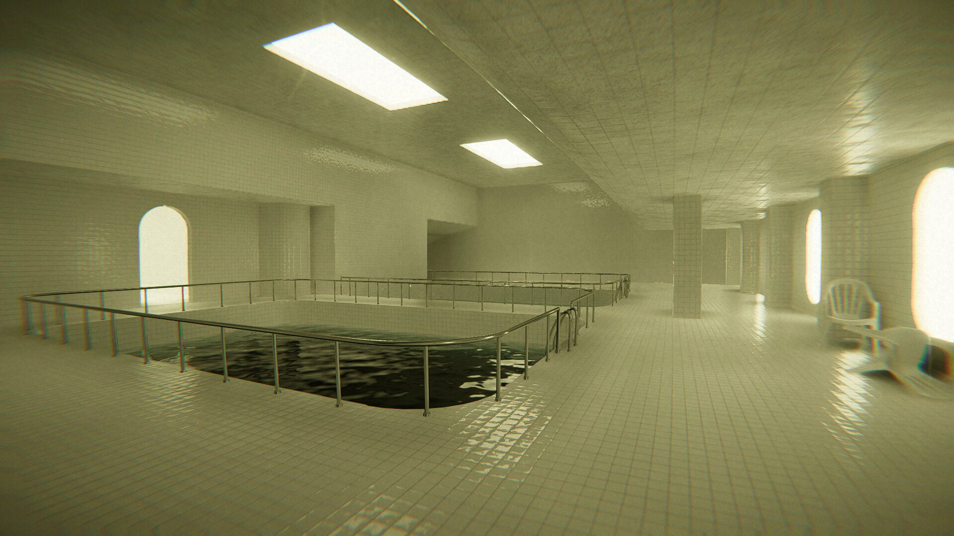 After several not-quite satisfying attempts, we started shifting our focus away from level geometry and more towards materials. Some of the abstract Backrooms-style games caught my eye. Although this is way too abstract for our purposes, I did think it was interesting how simple shapes and minimal design could be made to look both beautiful and somehow more realistic than some more complex scenes. This idea was intriguing to me.