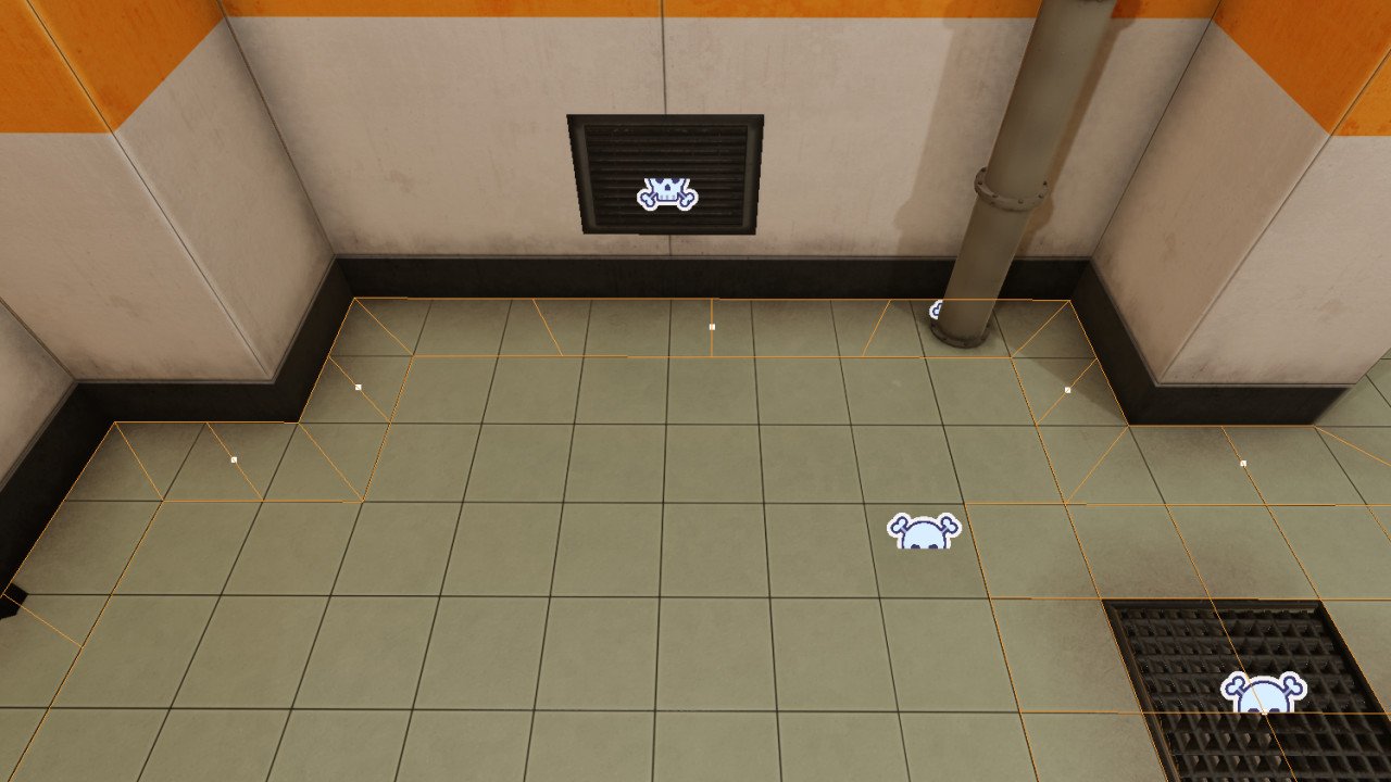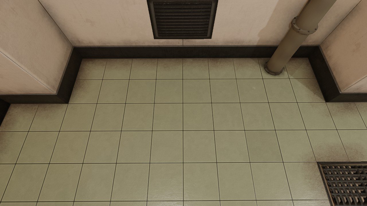 We used the vertex material painting feature to add a light layer of dirt all around the permeter of the floor, and around the grates embedded in the floor. Rather than subdivide the entire floor into small pieces, @reepblue modeled a "skirt" of brushes all around the perimeter, and added a 4x4 subdivided block under each vent. This gave us enough geometry to add detail in the right places.