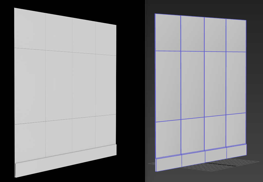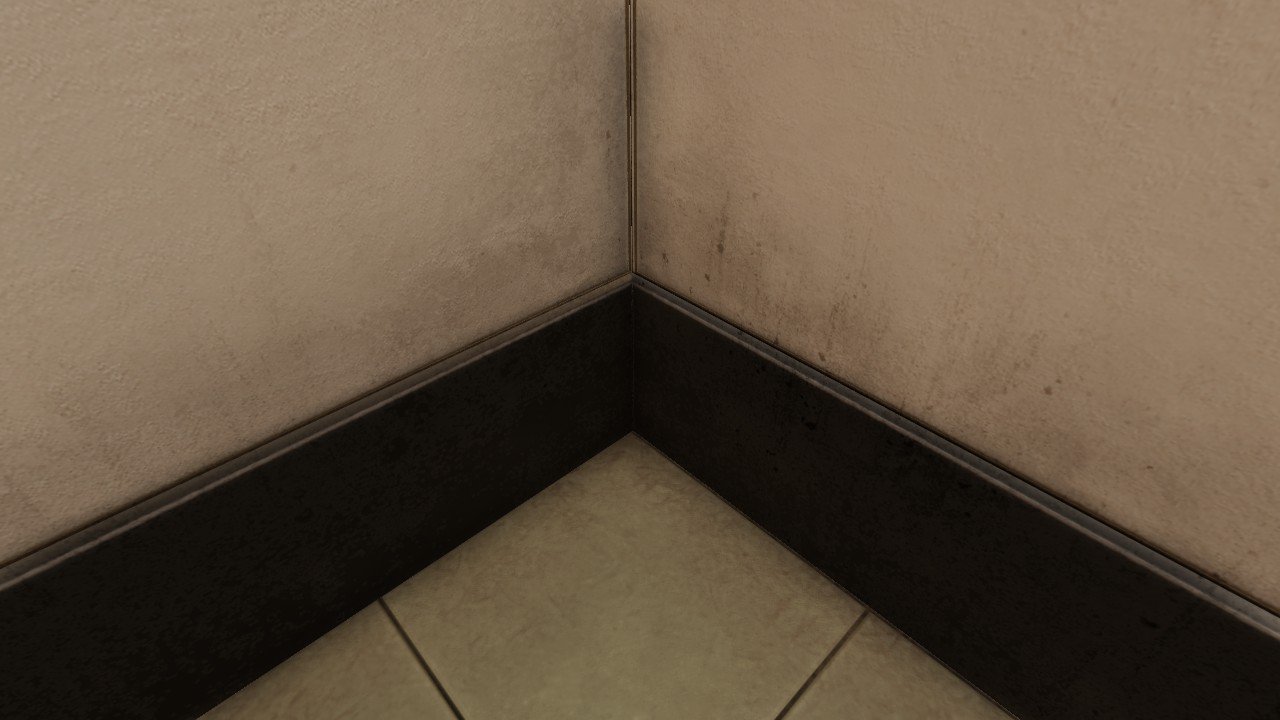 The baseboard is baked into the wall normal map. It's just one flat piece with no geometry for the base.