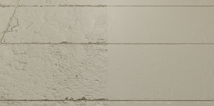 The walls in our facility are made of painted cast concrete. One thing that jumped out at us immediately when comparing our initial renders to our photographic sources was that our normal maps were way too strong. I think designers had a strong urge to make sure normal maps were highly visible when the technique first arose, but these deeply pitted surfaces can detract from the realism. We also found that too much noise in the surface would decrease the visibility of deep cuts that actually should have strong normals, so we adjusted the balance of these two layers, as well as the overall normal strength of the material.