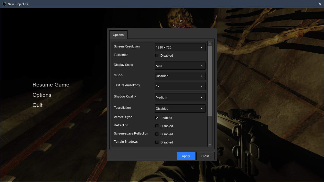 A new game menu system has been added into the default project template, for both C++ and Lua. This will enable a menu system for your game, along with options for graphics settings, and automatic save and load of your game's settings in a JSON file. Since all the code is included in the project, you can modify it, remove it, or use it as-is.