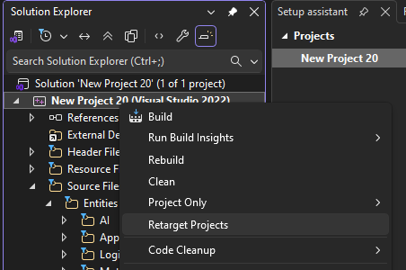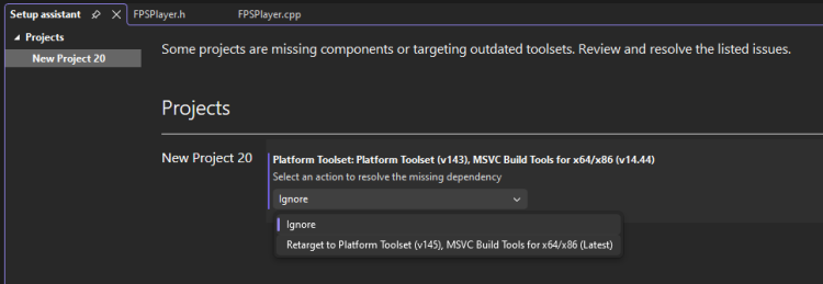 C++ library is updated for Visual Studio 2026. This is only available on the beta branch of Leadwerks Game Engine (app 251810 on Steam). To update your existing projects, open them in Visual Studio 2026, Right-click on the project and select the "Retarget Projects" menu item. In the dialog that appears, change the platform toolset to the latest version available