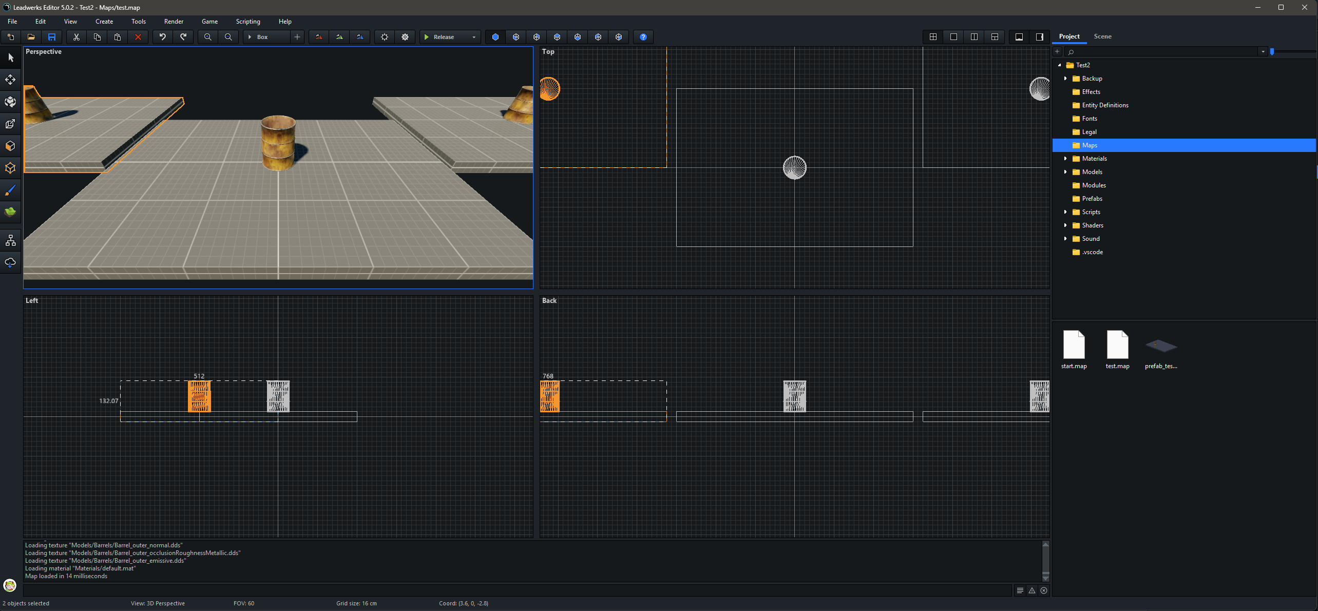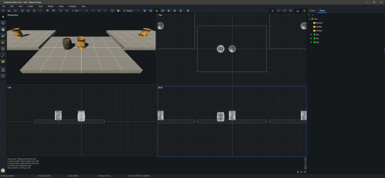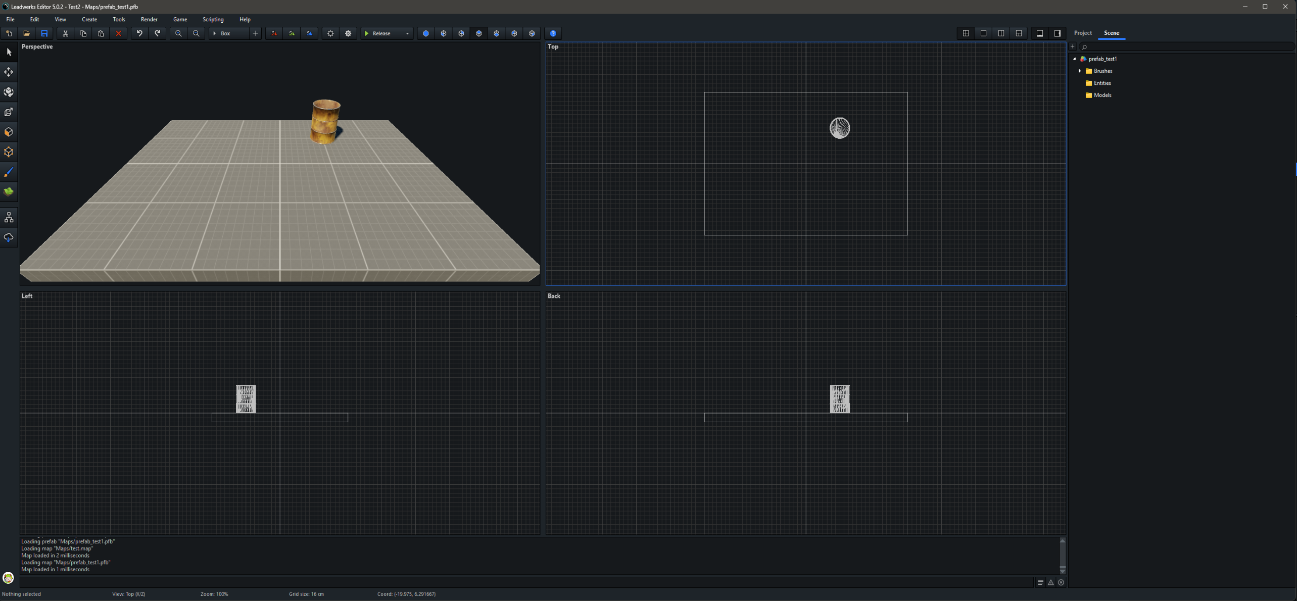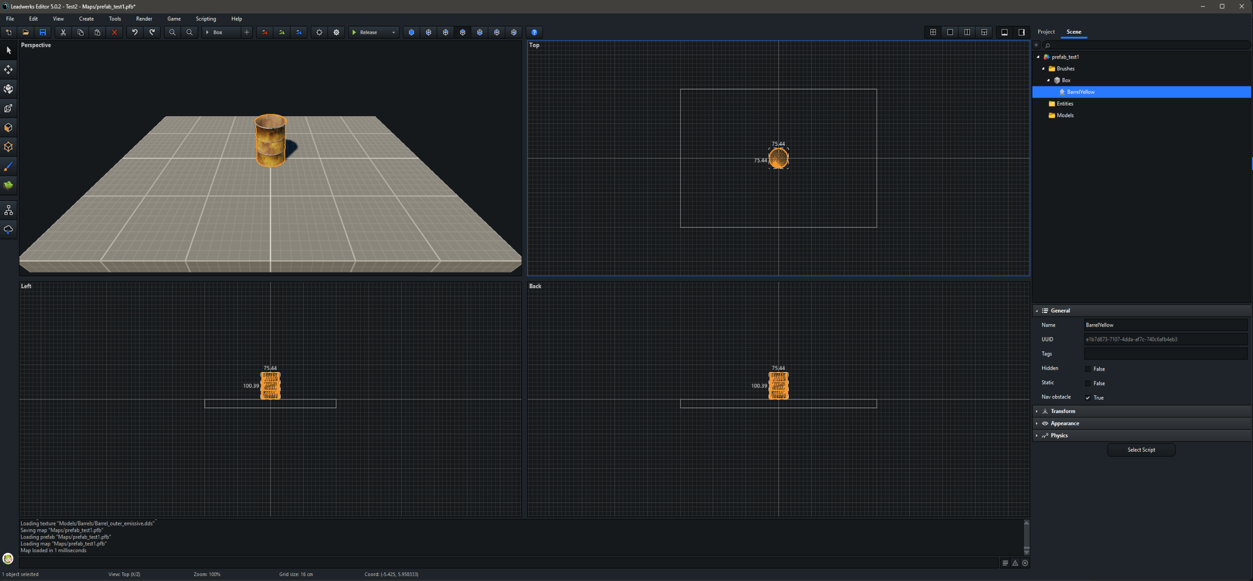 I'm finding that prefabs aren't working quite as expected. I made a simple test. Numbers correspond to images attached. 1 - I created a simple map that contained one brush for the floor and the stock barrel object. The barrel is the child of the box brush. I then saved the map as a prefab. 2 - I started a new map and dragged in the prefab. Then I dragged in two more copies from the right-side panel for a total of three. Then I saved the map. 3 - I opened the original prefab file and moved the stock barrel model to a new position and saved it. 4 - I opened the previous map with the three instances of the prefab and the stock barrel model was not repositioned but maintained the original barrel position. To be sure, I exited the Leadwerks editor, restarted and re-loaded the same map. The barrel did not move. 5 - I opened the prefab file again and added a new barrel (one of my own custom models) and saved the prefab. Then I opened the map file with the three instances of the prefab. The first prefab I had originally placed showed the newly added barrel model. The original stock barrel model was still in its original position (i.e. it had not moved even though I had moved the barrel in the prefab). My expectation is that if I alter the original prefab that any map that references that prefab will update to those alterations when the map is opened in the Leadwerks editor. So far, this is not happening.