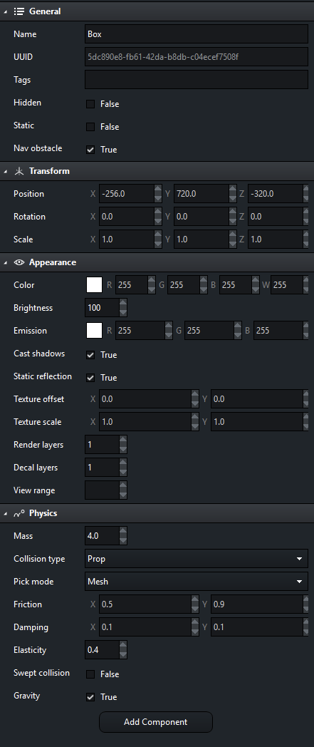 Hi, I'm new here. First of all, thank you for your work, I'm glad to see new game engines on the market. I just downloaded Leadwerks. One thing I noticed in my first test: 1. Create a terrain 2. Create a Box 3. Create a Point Light 4. Create a camera with FPSPlayer component The result is that the player collides with the boxes shadow. I am able to push the box from all sides where there is no shadow, but on the shadow sides the box is kinetic/immovable. Here is a short video to visualize what I mean: https://streamable.com/1wdmub The camera and FPSPlayer are default. Here are the properties of the box: