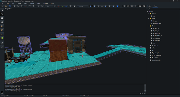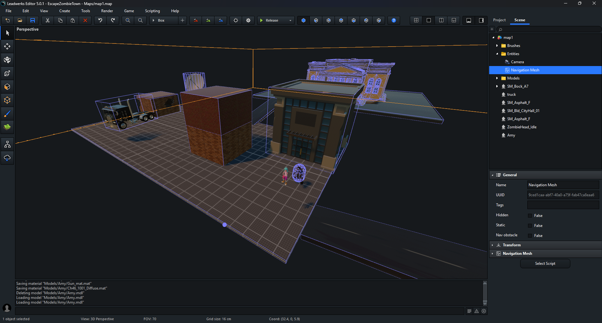 It looks like creating a NavMesh doesn't require much code. First, create the NavMesh in the editor, then write the following code: --First, Zombie_Head:Load is called, then Zombie_Head:Start function Zombie_Head:Start() zombie = Model(self) zombie:Animate("idle") if self.navmesh then self.agent = CreateNavAgent(self.navmesh, 0.5, 0.5) self.agent:SetPosition(self:GetPosition(true)) self.agent:SetRotation(self:GetRotation(true).y) self:SetPosition(0, 0, 0) self:Attach(self.agent) self.navmesh:SetDebugging(true) end end function Zombie_Head:Load(properties, binstream, scene, flags, extra) self.navmesh = nil if #scene.navmeshes > 0 then self.navmesh = scene.navmeshes[self.navmeshindex] end return true end then you should call NavAgent:Navigate like so: -- to move a Zombie to a main character's position after a mouse click function Zombie_Head:Update() if window:MouseHit(MOUSE_LEFT) then p1 = self.agent:GetPosition(true) p2 = self:GetPosition(true) --window.text = tostring(p1.x) .. " | " .. tostring(p1.y) .. " | " .. tostring(p1.z) window.text = tostring(self.agent:Navigate(p1)) self.agent:SetMaxSpeed(2) end end But self.agent:Navigate(p1) always returns false and a character doesn't move.