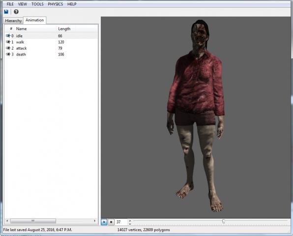 Well, I've bought the model, but animations did by myself. I think I cannot just post this model on forums. I'm gonna try to say what's wrong. I have a model. Here: As you can see - all vertex are assigned and animations works fine: File is in .fbx format: After importing fbx again in my editor (MilkShape 3D 1.8.5 beta2) - Everything is fine. LeadWerks automatically see .fbx file as .mdl Here we go to Edit mode in Leadwerks. As you can see - editor can see there are 17 frames. I'd made "Extract" Run animation to see if it helps - but no. Always I use "play" button - there are 1 frame animation that doesn't change, even if number of animation goes forward. Any ideas?