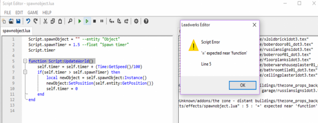 I'm trying to create a script that spawns an object every so often at a set time, but I keep getting a script error that says " '=' expected near 'function'". I'm new to programming and have no clue what that means. here's a screenshot of it in context. ANy help would be very appreciated. Script.spawnObject = "" --entity "Object" Script.spawnTimer = 1.5 --float "Spawn timer" Script.timer function Script:UpdateWorld() self.timer = self.timer + (Time:GetSpeed()/100) if(self.timer > self.spawnTimer) then local newObject = self.spawnObject:Instance() newObject:SetPosition(self.entity:GetPosition()) self.timer = 0 end end