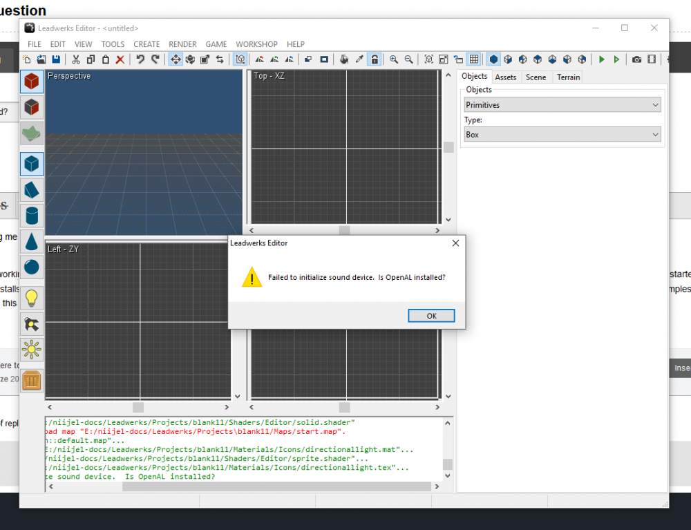 Leadwerks giving me 'openAL not installed' error at startup and then ending. Leadwerks was working fine till I installed the beta (4.4) but since then a full uninstall and reinstall not only of the production version but the latest beta (4.6) has made no difference. I started wondering if other software installs had messed something up, or windows update or a over active anti malware app. I have no sound issues with other software. The steam file checker reports no problems. I am happy to check or provide samples of anything on the pc to resolve this - After it happened I had to use Unity for a project and it was a hell of a grind - any help gratefully received :-) Thank-you