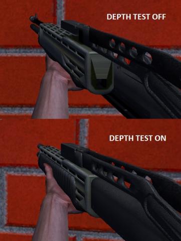 I am trying to make sure that "camera objects", such as weapons, never go through the level geometry. Back in the DarkBasic days there used to be a command to disable object's z-depth. I think the closest match in LE is the Depth Test setting in the material editor. In the image below I disabled depth test for both the shotgun and the hand's materials. Either or but the result is not what I expect. I need the model "to be on the top" of everything else while maintaining the visual integrity. Thanks.