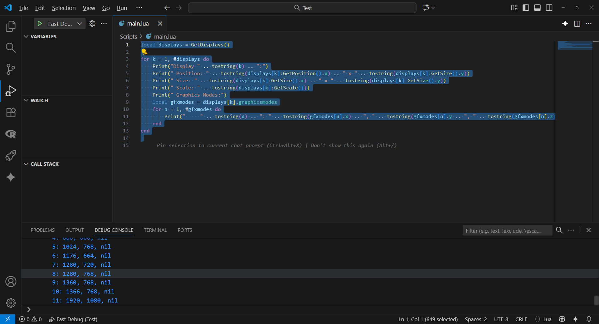 Yue Posted 9 hours ago Posted 9 hours ago local displays = GetDisplays() for k = 1, #displays do Print("Display " .. tostring(k) .. ":") Print(" Position: " .. tostring(displays[k]:GetPosition().x) .. " x " .. tostring(displays[k]:GetSize().y)) Print(" Size: " .. tostring(displays[k]:GetSize().x) .. " x " .. tostring(displays[k]:GetSize().y)) Print(" Scale: " .. tostring(displays[k]:GetScale())) Print(" Graphics Modes:") local gfxmodes = displays[k].graphicsmodes for n = 1, #gfxmodes do Print(" " .. tostring(n) .. ": " .. tostring(gfxmodes[n].x) .. ", " .. tostring(gfxmodes[n].y .. ", " .. tostring(gfxmodes[n].z))) end end Quote Murphy's Law: We don't fix bugs, we document them as features. – Murphy Games