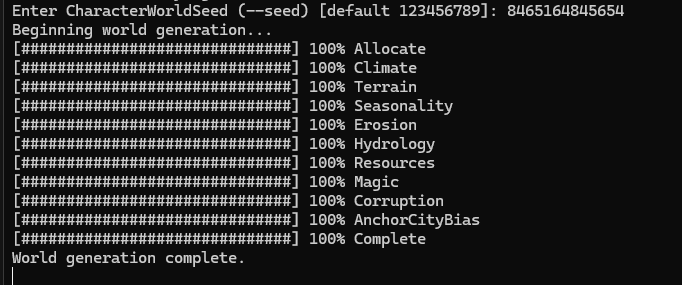 VelocityRaptor Posted 11 hours ago Author Posted 11 hours ago Sure. I'm kinda taking a page out of Dwarf Fortress's book and making a game where you generate the world first and then the characters you create live in that world. World gen is handled by layering a bunch of different fields on each other, each representing different. First is a land/water field where anything below a certain value is water. Then we layer on a height field, influence it by a separate ridge field to not only give us mountains, but to also have them appear in ranges. From there, a hydrology pass is made to determine rivers and lakes, along with other stuff. All of this is derived by the seed, with the world gen saving only the macro-world data, such as the biome, if there's any water, the min and max height for that cell, if there are any resources. etc. Various properties about the macro-cell are derived based on how that data mixes, such as deserts appearing not because a height map said so, but because the water value was low, and it was close to the equator. Rendering the world is purely deterministic at that point, since the macro world data encompasses cells that are 32x32km each. So when it gets to rendering the area where the player is at, it samples the height data from the derived functions and generates the terrain from that. I found an Leadwerks blog post talking about handling large terrain areas with what is effectively a sliding window, referencing new height values and rebuilding the terrain. This ended up being a much more performant route than trying to generate new terrain chunks. It was much more reliable too, since now I didn't have to worry about seams or stitching, since it was always sampling the same window. This part of the terrain gen is where the suggestions are coming from, I was able to knock out almost all of the performance issues, except for the last bit. Doing some diagnostics, showed that the per-vertex write to the terrain object was about 100ms. When I tried to do it in a worker-thread and write it to a back-terrain object using a time budget method, I was actually able to have the terrain generate with no noticeable hitching, the resulting terrain ended up having stripes from having the terrain built in sections. The striping went away when I did the rebuild all in a single tick. Below are screenshots from a MacroWorldVisualizer tool I wrote so I could spot check the world gen to make sure everything was working properly. Note that the world is a cylinder, so it wraps left/right, but is clamped up/down. 2 Quote